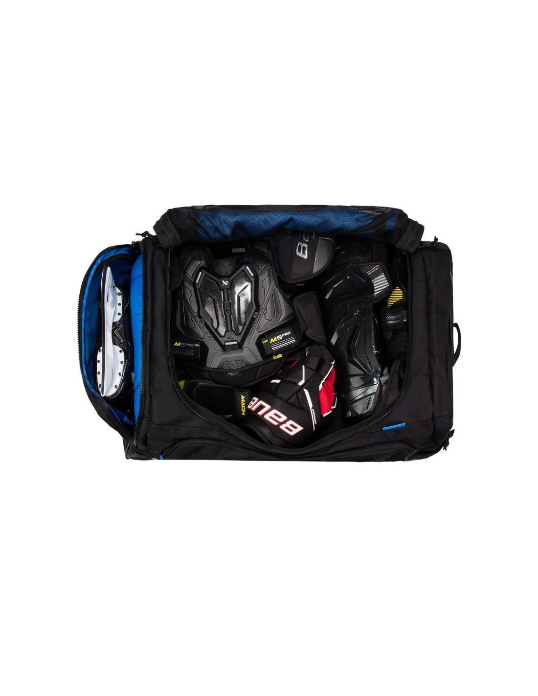 La bolsa Bauer Elite Carry está fabricada en poliéster 600D y RIPSTOP, con cremallera YKK, correas resistentes y asas ajustables para los hombros. Sus características de organización incluyen un amplio compartimento principal con cremallera en forma de D, un divisor para patines, un panel organizador y un bolsillo externo para botella de agua.
